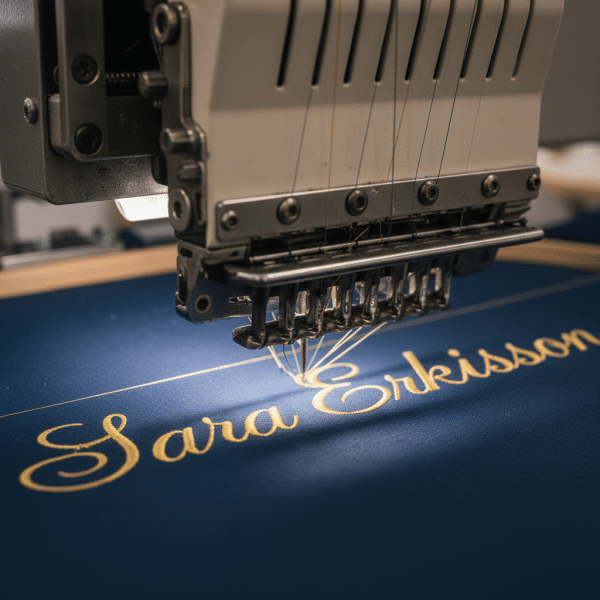Brodyren kommer placeras på vänster bröst. Finns redan ett emblem på vänster sida kommer brodyren att placeras på höger bröst. Vid lång text kommer brodyren placeras på två rader.