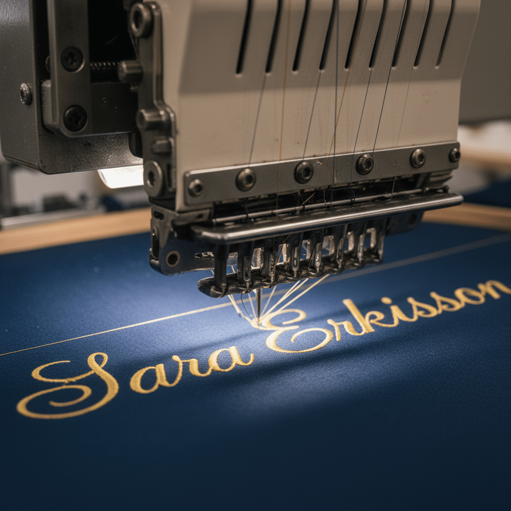 Du får själv välja vart brodyren ska placeras, antingen på vänster bak eller längs med vänster bog. Vid lång text kommer brodyren placeras på två rader.